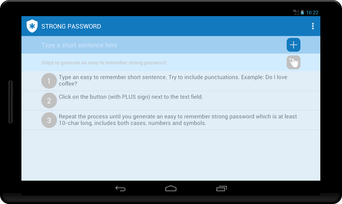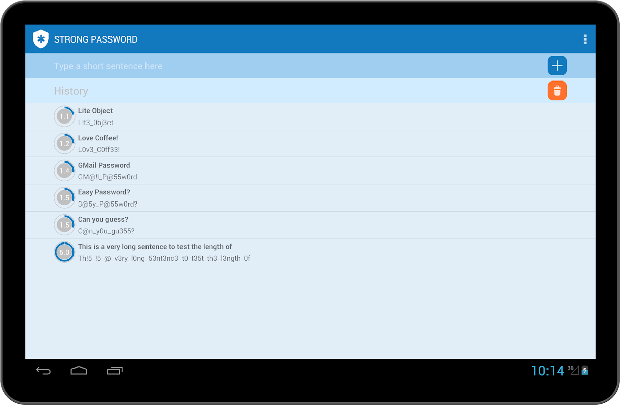 This app helps to generate a strong but easy to remember password by allowing a user to write a short sentence and then replacing some characters with numbers and symbols.