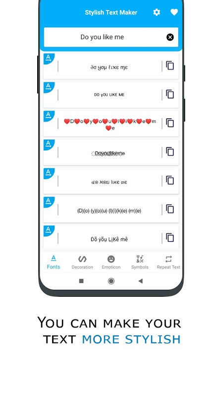 Die Stylish Text App ist ein großartiges Tool, um stilvollen Text oder Benutzernamen für Ihr Spiel zu generieren. Wählen Sie aus Hunderten von einzigartigen Symbolen aus, um Ihren Status lustig, stilvoll und mit schönem Designtext in sozialen Medien zu etwas Besonderem zu machen. Diese STYLISH TEXT App hat auch mehr Funktionen wie,