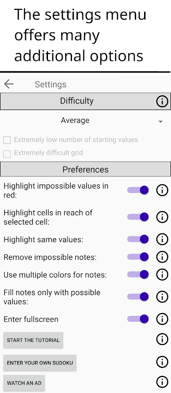 The App does not bother you with a full screen Ad whenever you finish a Sudoku or want to go to a different menu. We know most Sudoku Apps do use these ads, so we are hoping you appreciate this! (If you do want to support us, there is a button in the settings menu that will make you watch an Ad)