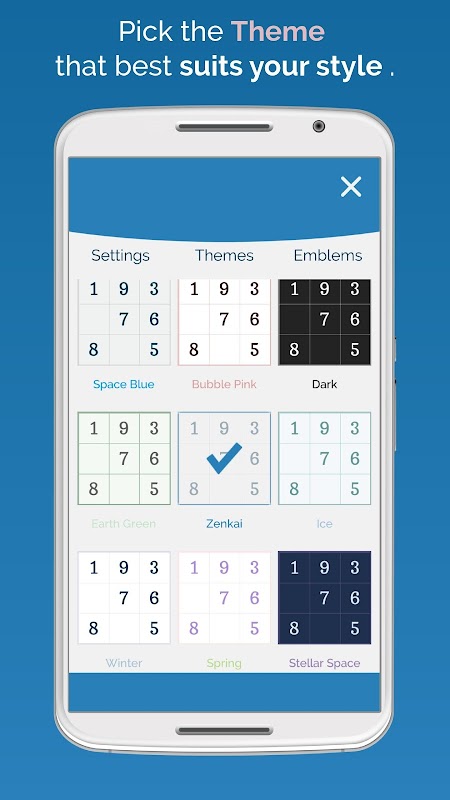 Sudoku Zenkai bietet verschiedene Themen, sodass Sie Ihren Lieblingsstil wählen können. Keine Lust auf Zahlen? Mit den Sudoku Zenkai-Emblemen können Sie jedes Sudoku-Rätsel mit Buchstaben, Griechisch, Kanji und mehr aufpeppen.