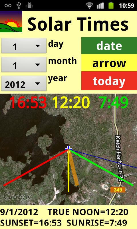 Der Winkel der Sonnenuntergang und Sonnenaufgang sind auf der Karte eingezeichnet. Sonnenuntergang ist in grün, Sonnenuntergang in rot dargestellt. Die gelbe Linie zeigt nach Süden, und stellt wahren Mittag.