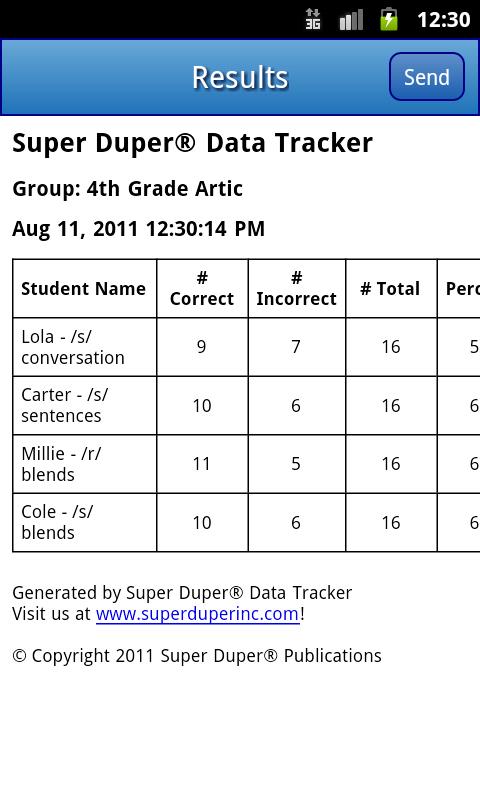 Spend more time treating and less time tracking with this easy to use app! The Super Duper® Data Tracker lets you document and monitor your student’s progress using your Android phone or tablet. Simply organize your students into groups. Then enter your student’s names and even their goals. Track incorrect and correct responses discretely and efficiently.