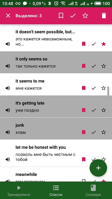 Das Wortlernen wird durch das Demonstrieren und Aussprechen englischer Wörter in zufälliger Reihenfolge organisiert. Außerdem wird die Übersetzung des Wortes nur angezeigt, wenn Sie auf eine spezielle Schaltfläche klicken. Die schwierigsten Wörter können mit einem Sternchen markiert werden, die Wiederholung solcher Wörter kommt häufiger vor, sodass die Assimilation komplexer Wörter effektiver ist.