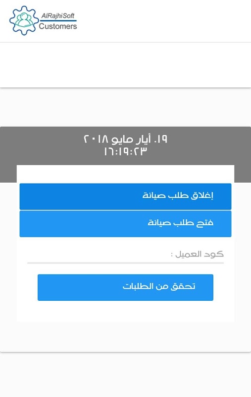 بعد ادخال كود العميل الضغط على زر التحقق من طلبات لتظهر جميع طلبات الصيانة اللتي قد قمتم ب فتحها من قبل