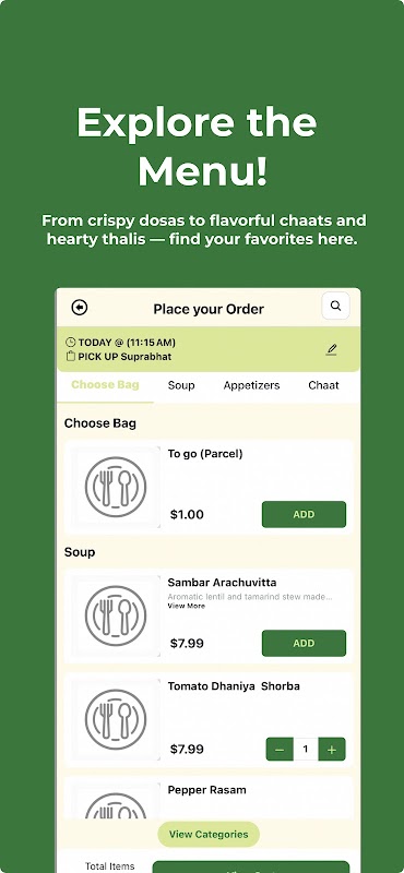 Entdecken Sie das neue Suprabhat App-Erlebnis – erleben Sie die Wärme, Reinheit und Lebendigkeit der indischen vegetarischen Küche direkt auf Knopfdruck! Unsere App verwöhnt Ihren Gaumen mit unkomplizierter Bestellung, attraktiven Prämien und exklusiven Vorteilen. Lust auf ein Thali, eine Party oder ein Abendessen unter der Woche? Unsere App erledigt alles.