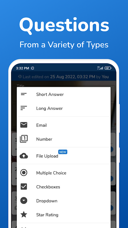 Erstellen Sie Umfragen/Formulare mit 9 verschiedenen Arten von Fragen, die häufig zum Sammeln von Antworten verwendet werden. In unserem Formularersteller können Sie Ihre Formularzugriffsebene für die Antwortenden steuern, z. B. (i) ob sie Ihre Ergebnisse sehen können oder nicht, (ii) ob sie mehrere Antworten geben dürfen oder nicht, (iii) ob Fragen Ihres Formulars gemischt werden oder nicht.