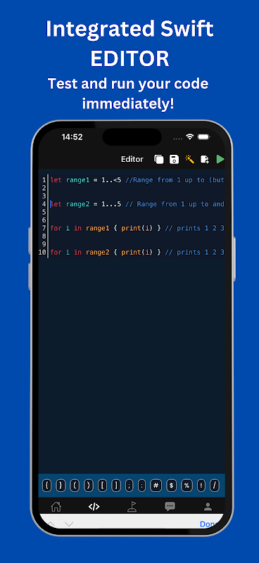Integrierte IDE: Swift Academy umfasst eine integrierte Swift-IDE, sodass Sie Swift-Code direkt auf Ihrem Mobilgerät schreiben, testen und ausführen können. Mit dieser mobilfreundlichen Funktion können Sie unterwegs programmieren, ohne einen Computer zu benötigen, sodass Sie überall üben können.