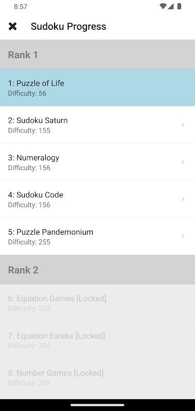 Diese App enthält 100 Rätsel unterschiedlicher Schwierigkeitsgrade. Sie sind in Ränge mit jeweils fünf Spielen unterteilt. Die schwierigeren Ränge werden durch das Abschließen von Spielen der einfacheren Ränge freigeschaltet.