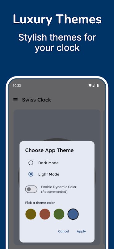 Elegante Schweizer Uhr mit Widgets, Live-Hintergründen, Themen, Alarm und mehr