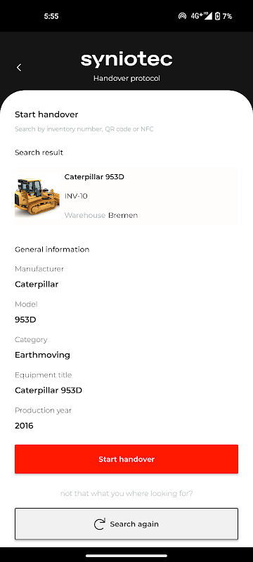 - Automatische Datensynchronisierung mit syniotec Rental Asset Manager: Alle in der App erfassten Informationen werden automatisch mit Ihrem Konto im syniotec Rental Asset Manager synchronisiert, was Ihnen Zeit und Mühe spart.