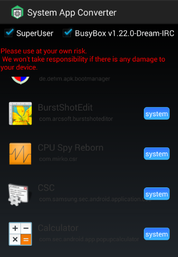 WARNING: Converting some important System apps to User apps might make the device unusable!