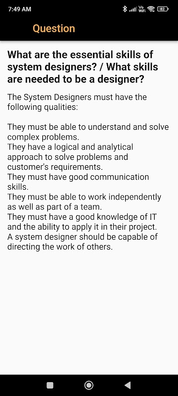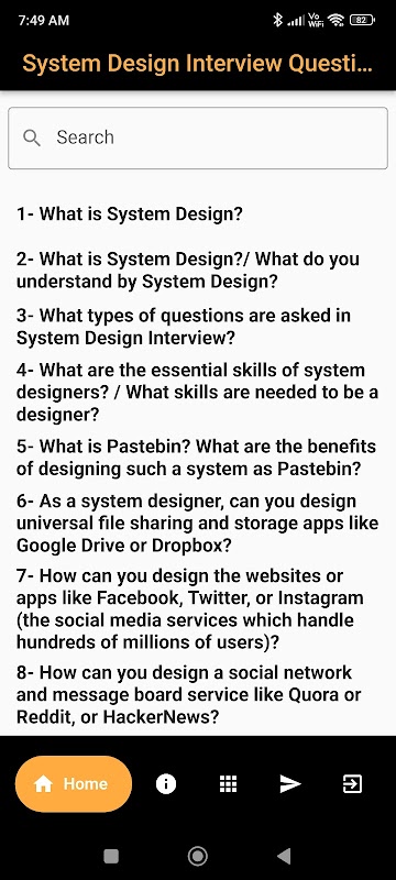 Fragen zum Systemdesign-Interview: Für diejenigen, die sich speziell für Systemdesign interessieren, enthält unsere App einen speziellen Abschnitt mit über 100 Fragen, die sich auf Systemdesignkonzepte konzentrieren. Vertiefen Sie Ihr Wissen und stärken Sie Ihr Selbstvertrauen im Systemdesign-Interview.