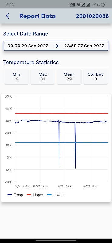 2. Die Anwendung zeichnet ein Temperaturdiagramm der vom Sensor erfassten Daten und ermöglicht das Herunterladen der Daten als PDF.