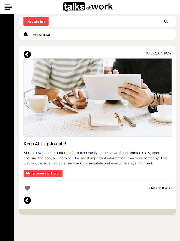 Hol dir die „talks at work“-Community App und vernetze dich mit anderen Gamechangern, um die Zukunft der internen und externen Unternehmenskommunikation zu revolutionieren. Präsentiere im Business Hub deine Expertise, teile offene Jobs und anderen Neuigkeiten über dein Unternehmen. Vertiefe dein Netzwerk durch den direkten Austausch im Chat, profitiere von exklusiven Einblicken in die trending Topics von morgen! Plus: Sei bei unseren exklusiven Events und Netzwerktreffen dabei. Bewirb dich jetzt auf talksatwork.com/community und sichere dir deine exklusiven Zugangsdaten für die App.