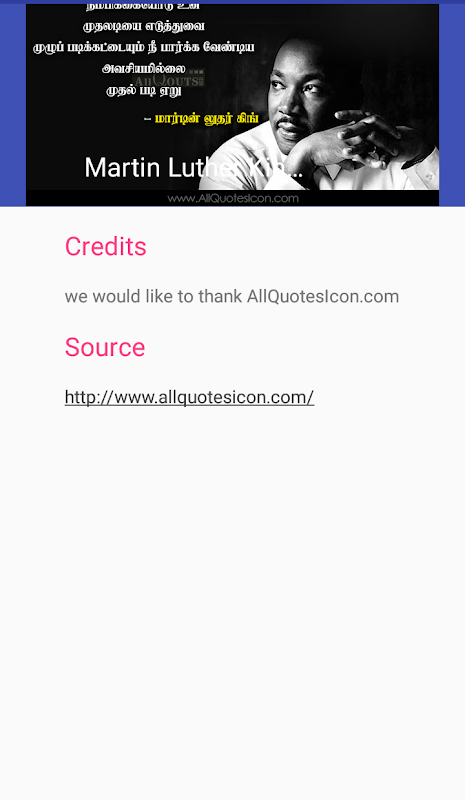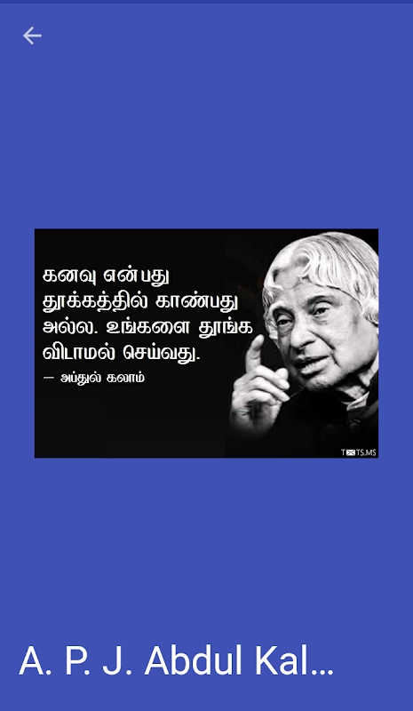 Contains impressive quotes to cheer and encourage everyone who reads it irrespective of any constraint.it comes along with pleasant pictures ,new quotes everyday and has the feature of sharing. the main highlights is that it includes Tamil version of famous quotes, quoted by great leaders , notable personalities and so on.