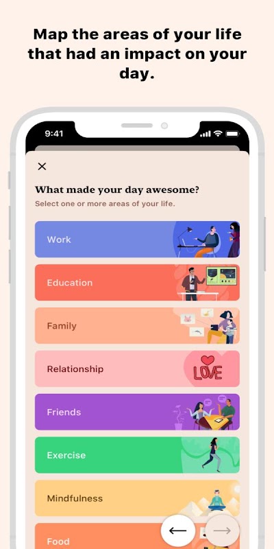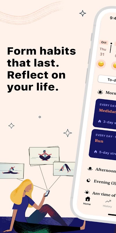 Your routine has a big impact on how you feel. That's why we've integrated mood tracking and journaling with habit tracking. At the end of each day, take a moment and reflect on it by rating how it was, what made it that way and why.