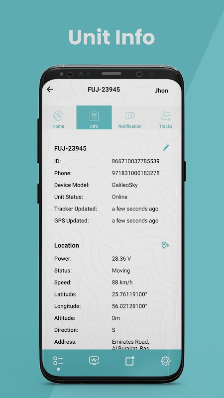 • Aktivitätsstatus der Einheit wie Leerlauf, Parken, Bewegen, Anhalten usw.