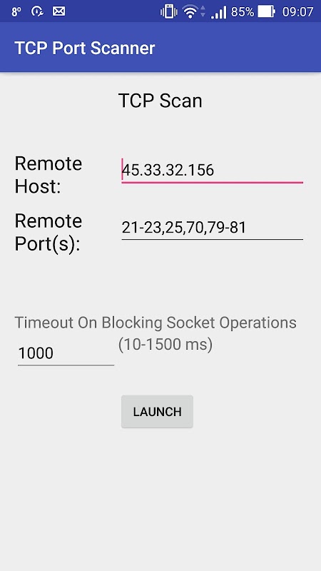 Sie müssen Remote-Host als eine IPv4-Adresse, Ports angeben und Portbereiche als Argumente (die durch Komma getrennt sind), und die Timeout-Zeit auf Socket-Operationen blockiert.