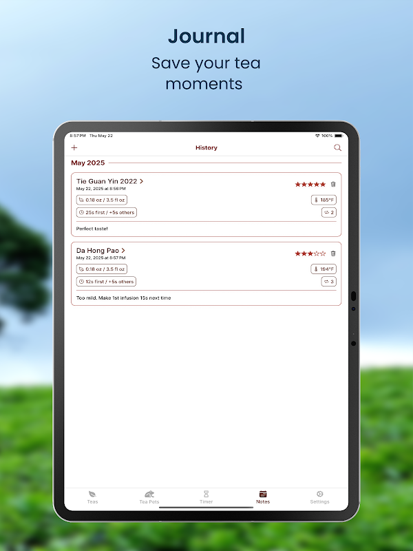 Verfolgen Sie Brühparameter, die perfekt (oder schlecht) funktioniert haben. Verfeinern Sie Ihre Tee-Geschichte, um Ihre Technik zu verfeinern und die Entwicklung Ihres Geschmacks zu beobachten.