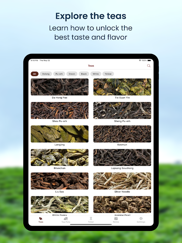 Meistern Sie die Kunst der Teezubereitung mit der ultimativen Tee-Timer- & Tagebuch-App. Verfolgen Sie Ziehzeiten, notieren Sie Verkostungsnotizen und entdecken Sie Teesorten von Oolong bis Pu-Erh. Ihr perfekter Teebegleiter für die perfekte Tasse Tee – jedes Mal.