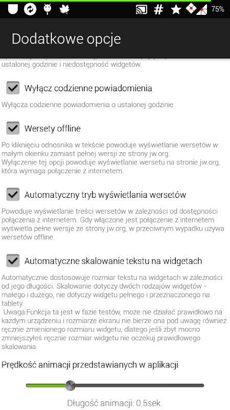 - Aplikacja przypomni (o ustalonej godzinie) za pomocą powiadomienia na pasku statusu o nowym tekście dziennym do przeczytania gdy zmieni się data (z dźwiękiem lub bez).