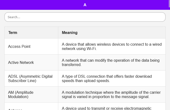 Sofortsuchfunktion: Müssen Sie schnell einen Begriff finden? Mit der leistungsstarken Suchfunktion können Sie beliebige Telekommunikationsbegriffe eingeben und sofort Ergebnisse erhalten. Kein endloses Scrollen mehr durch Seiten!