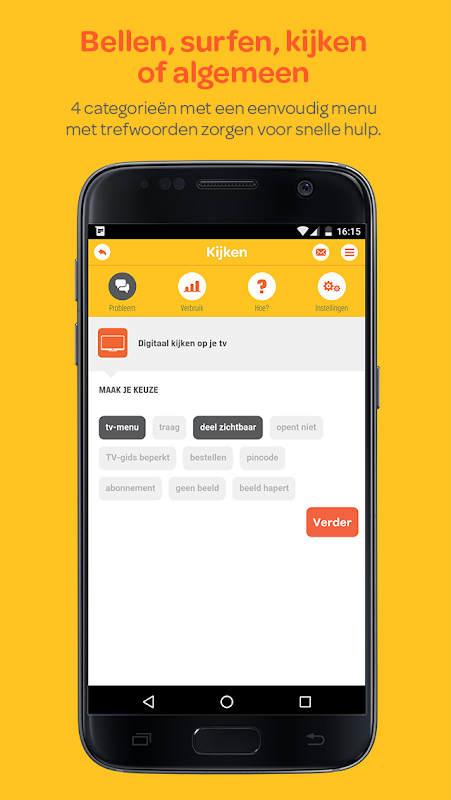 · Bellen, surfen, kijken of algemeen? Jij kiest in een eenvoudig menu uit een aantal trefwoorden en geeft zo aan waarover je vraag gaat