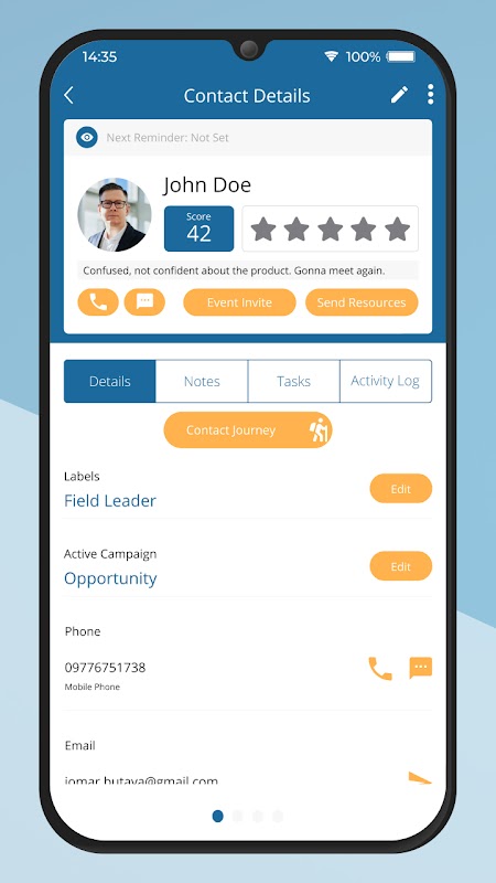 Halten Sie eine Bibliothek mit Ressourcen bereit, die Sie mit potenziellen Kunden und Kunden teilen können: Audio, Video, PDFs und mehr – direkt auf Ihrem Smartphone. Von dort aus können Sie sie nahtlos über soziale Medien, per E-Mail oder SMS teilen. Teilen Sie wertvolle Produktinformationen mit Ihren Kunden, binden Sie sie entsprechend ihrer Interessen ein und verfolgen Sie, wie und wann sie mit Ihren Inhalten interagieren. Erstellen Sie einen Follow-up-Flow und verpassen Sie keine Chance mehr, neue potenzielle Kunden zu gewinnen.