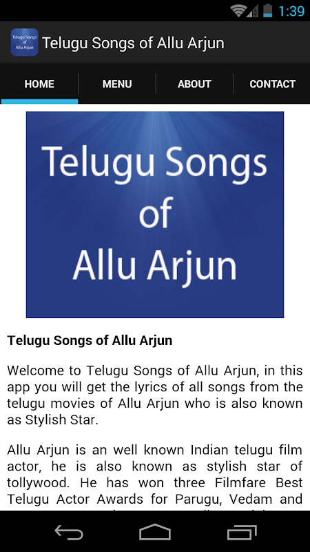Welcome to Telugu Songs of Allu Arjun, in this app you will get the lyrics of all songs from the telugu movies of Allu Arjun who is also known as Stylish Star.