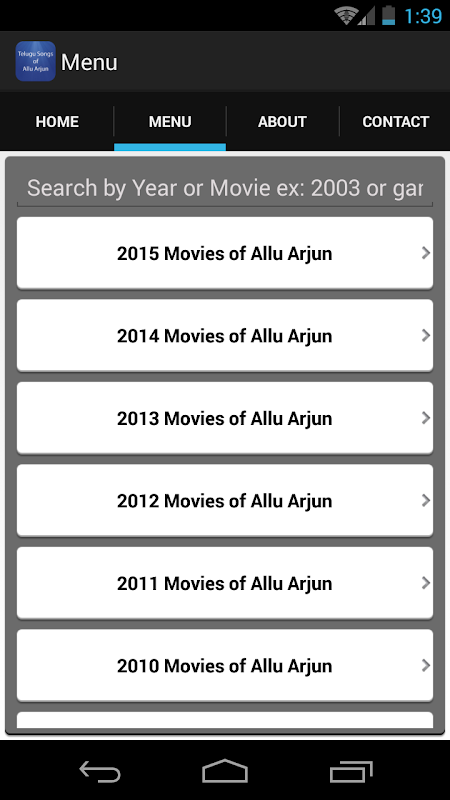 In this app you will get all songs lyrics and also you can search or filter the year list by searching with year ex: 2014 or you can also search by movie name ex: race guru then the list will be filtered to year the movie was released and then you can go ahead and see the specific movie details and list of songs from that movie and then later see the lyrics of that songs from that specific movie. One can open the lyrics of the song using this app and watch the telugu video song of that movie or listen to telugu audio song of that movie and can learn the lyrics or prepare for any singing competition.