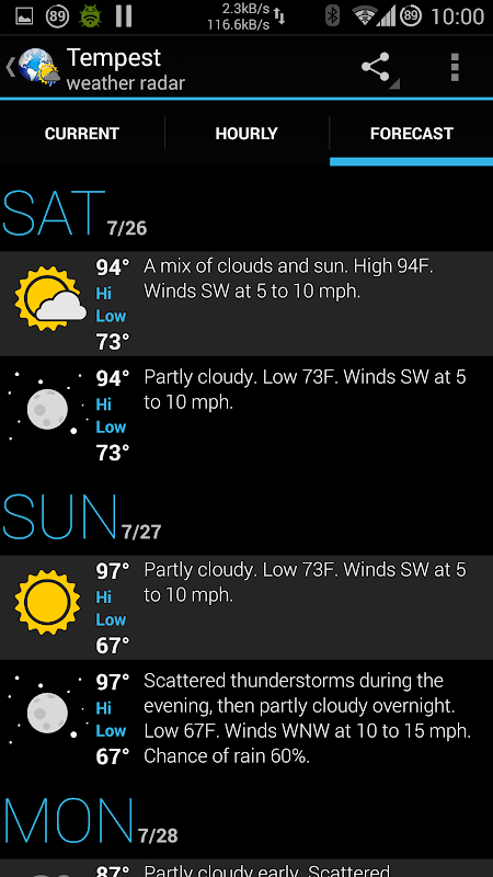 Although initially designed as a weather radar only solution, Tempest weather radar can retrieve current local weather conditions, 10 day forecast and hourly forecast data by tapping on the red location icon. Alternatively, "long pressing" on a map location will bring up the weather forecast of that location.