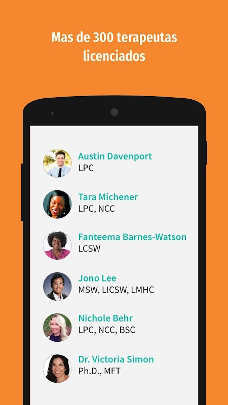 Hay más de 300 terapeutas en Terappeuta. Ellos son psicólogos licenciados, entrenados y acreditados (PhD / PsyD), terapeutas matrimoniales y familiares (MFT), trabajadores sociales clínicos (LCSW), asesores profesionales licenciados (LPC) o credenciales similares. Todos ellos tienen una Maestría o un Doctorado en su campo. Ellos han sido calificados y certificados por la junta profesional de su estado en los Estado Unidos, después de completar con éxito la educación necesaria, exámenes, formación y práctica. Todos poseen por lo menos 3 años y 2,000 horas de experiencia práctica.