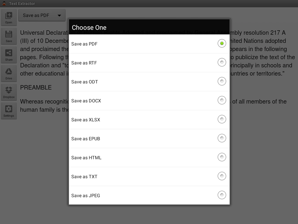 Hinweis: Sie müssen nicht über eine Internetverbindung Dokumente zu konvertieren, aber wenn Sie per E-Mail Ihre Dokumente senden möchten oder laden Sie sie auf Google Drive und / oder Dropbox Sie müssen 3G / 4G oder WiFi ermöglichen.