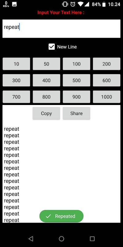 Text Repeater : Repeat It is a app that help you to repeat text as much as you want. You can share in another app. Text repeater is the best choice to you for spam chat your friend.