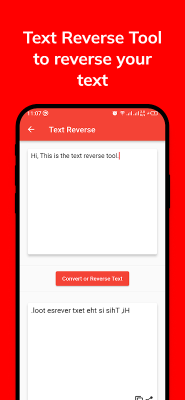 Unsere Text Reverse-App kann als Textwiederholer für bis zu 10.000 Wörter oder mehr, Reverse-Text-Generator, Reverse-Wortlaut, Reverse-Lettering, Flip-Text oder umgedrehter Text verwendet werden. Jeder, der ein Android-Telefon verwendet und in seinem täglichen Leben auf Text gestoßen ist, kann unsere Textumkehr- und Textwiederholungs-App nutzen.