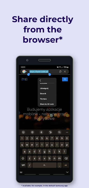 - Wenn Sie den Standard-Systembrowser verwenden, erscheint durch Gedrückthalten des ausgewählten Textes das folgende Element im Kontextmenü: „Mit QR-Code teilen“, das direkt zur Text To QR-Anwendung weiterleitet und einen Code generiert, der Sie können mit einer anderen Person zeigen/teilen/speichern;