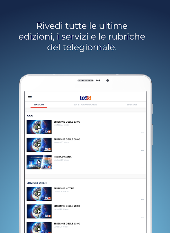 Geben Sie die Welt der Informationen mit der neuen App TG5: erneuert in Grafik, vollere in Inhalt, zugänglicher und schneller Navigation.