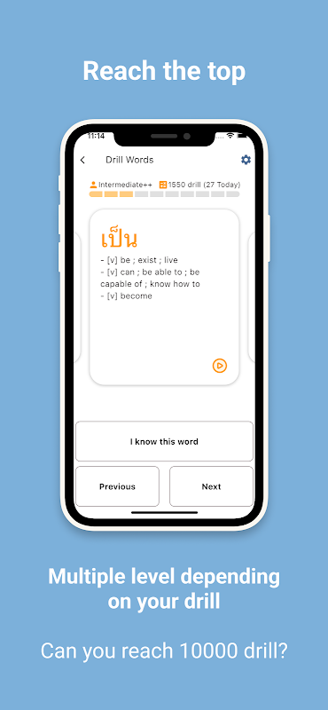 Erschließen Sie sich die Schönheit der thailändischen Sprache und Kultur mit Thai Drill, Ihrem ultimativen Hilfsmittel zum Erlernen der thailändischen Sprache. Ganz gleich, ob Sie eine Reise nach Thailand planen, Ihre beruflichen Möglichkeiten erweitern oder einfach nur in die thailändische Kultur eintauchen wollen, nehmen Sie sich nur 5 bis 10 Minuten pro Tag Zeit, um Ihre Thailändischkenntnisse zu verbessern! Laden Sie Thai Drill noch heute herunter und beginnen Sie Ihre Reise zu fließenden Sprachkenntnissen mit Selbstvertrauen und Leichtigkeit.
