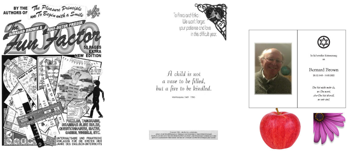 Das erste Buch wurde vor gut 30 Jahren erstellt und nun ist leider ein Autor Bernard Brown am 19.03.2023 nach einer schweren Erkrankung verstorben. Weiterleben sollen aber auf jeden Fall die englischen Lehrbücher für die Englisch-Lehrer. Diese App soll als Legende des Buches The Fun Factor dienen. Das Buch gibt es in Originalauflösung nun im digitalen Format oder auch im Papierformat (Restbestände) unter www.pleasure-principle.de