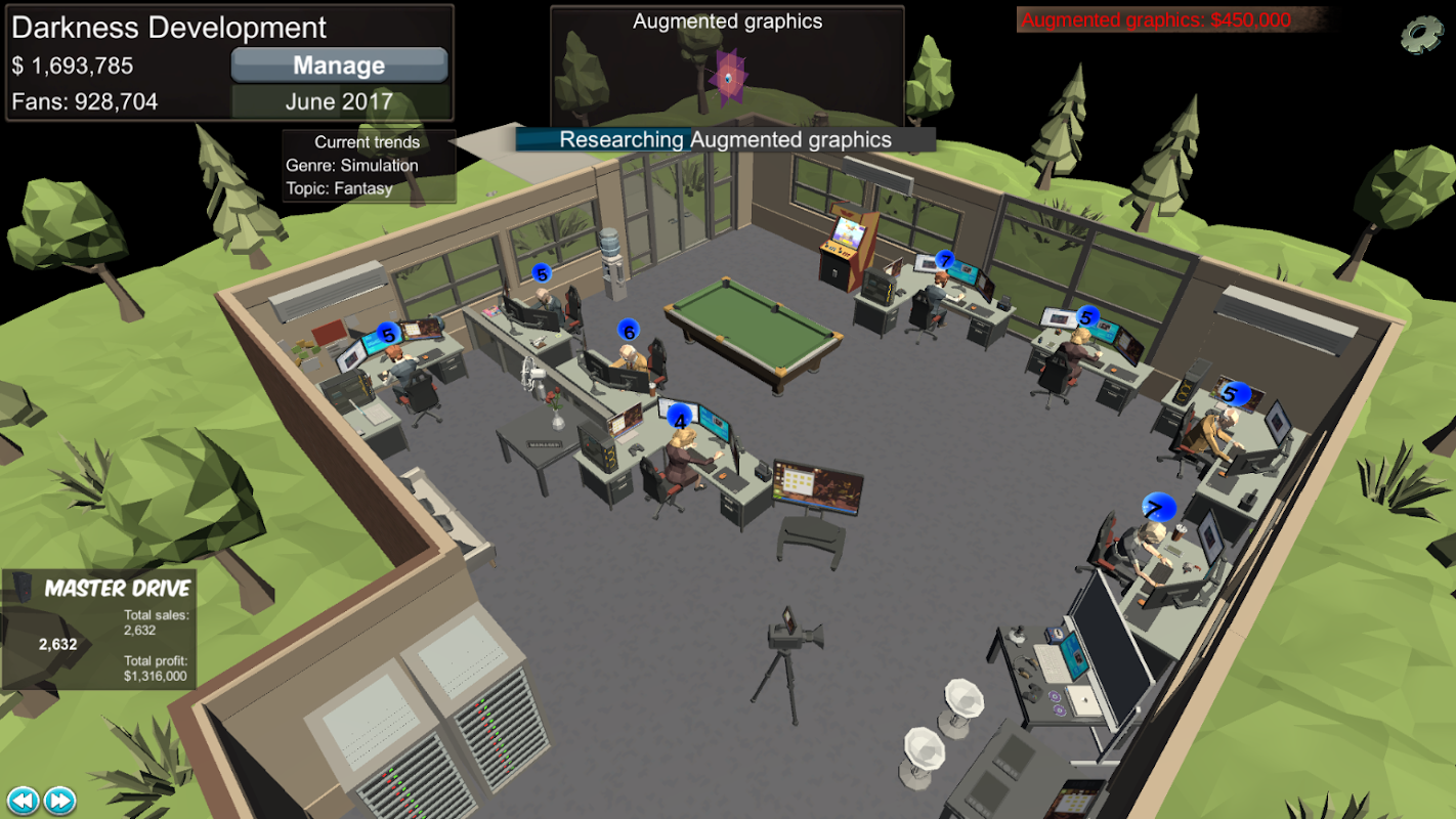 Lass dein Unternehmen wachsen, indem du aus deinem Keller in ein Büro ziehst, in dem sich andere Entwickler anschließen können. Baue dein Büro auf, um zusätzliche Fähigkeiten freizuschalten, die dir helfen, qualitativ hochwertigere Spiele zu entwickeln, oder versuche dein Glück mit der Entwicklung deiner eigenen Spielekonsole.