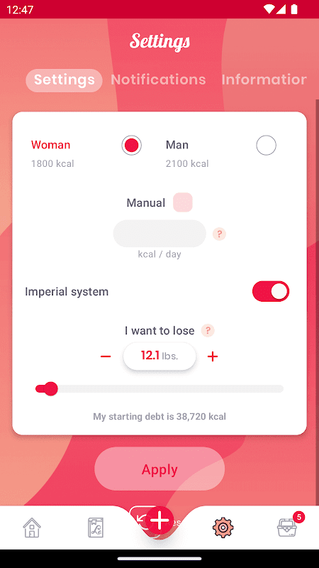 - Im Laufe des Tages können Sie die Lebensmittel, die Sie zu sich nehmen, hinzufügen und anhand der Essensbilder die Portionen auswählen, die Sie zu sich nehmen möchten. Eine kleine Anzeige zeigt Ihnen an, wie viele Kalorien Sie an diesem Tag noch verbrauchen müssen.