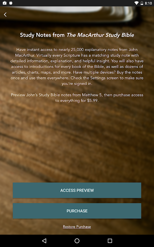 Mit dem In-App-Kauf der Notizen aus der MacArthur Study Bible haben Sie Zugriff auf fast 25.000 detaillierte Kommentare von John MacArthur, die praktisch jede Passage in der Bibel erklären. Zusammen mit den Notizen finden Sie Dutzende Artikel, Diagramme, Karten, Einführungen zu jedem Buch der Bibel und mehr.
