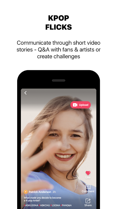 - Use the “Flicks” feature to share short, fun videos including your favorite K-Pop moments. Use the Q&A Flicks feature and submit questions to your favorite idols and get a video message from LOONA, KARD’s BM & more!