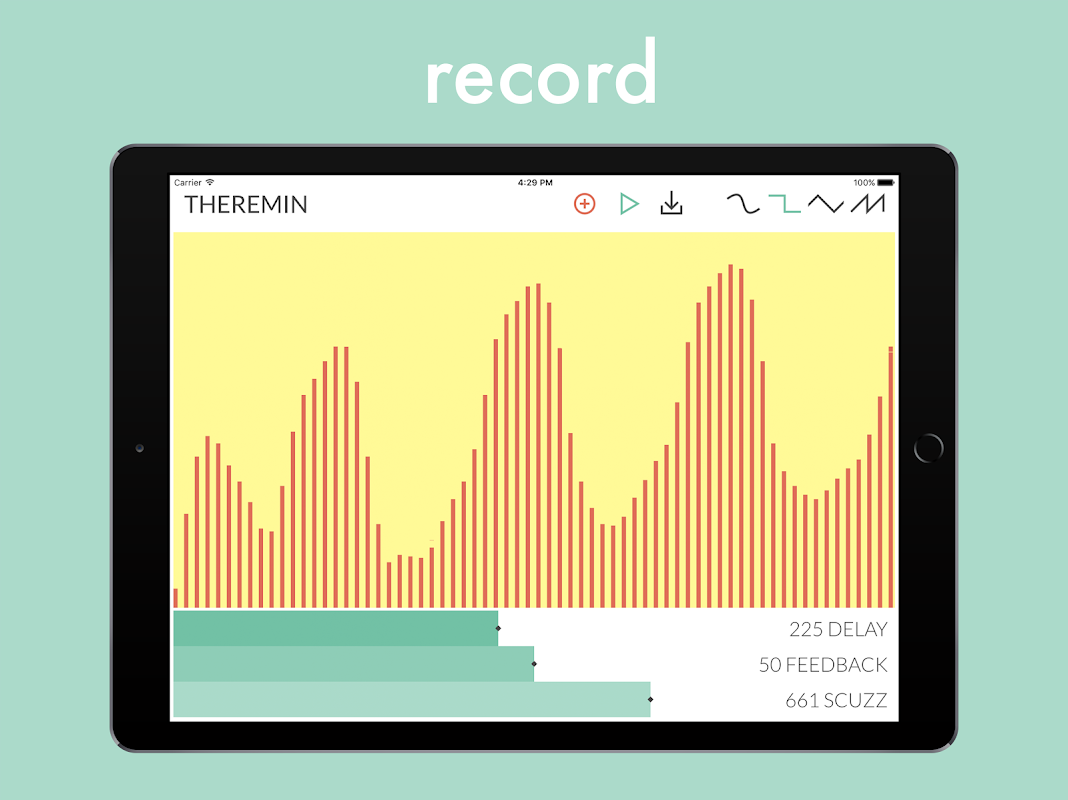 Dies ist ein Multi-Touch-Synth Instrument. Spielen Sie es durch Berühren und den Bildschirm zu klauen, die Änderung der Wellenformen und Verschieben der Effekte etwas von der traditionellen Sci-Fi-Theremin zu schaffen klingt zu tief scuzzy Soundscapes. Verwenden Sie die Looper Kontrollen zur Aufzeichnung, Schleife und Overdub-Schichten. Dann, wenn Sie Ihre Aufnahme speichern oder teilen, drücken Sie die Download-Schaltfläche, um Ihre WAV-Datei an andere kompatible Anwendungen wie Nachrichten zu senden, E-Mail, Dropbox usw.