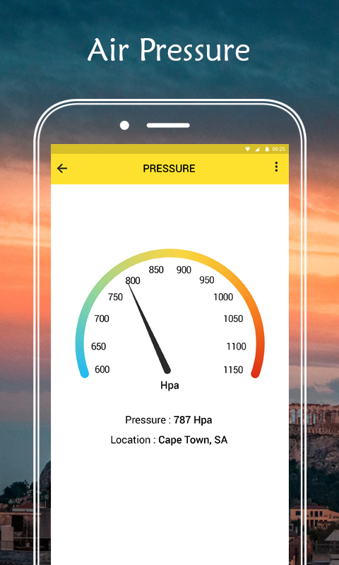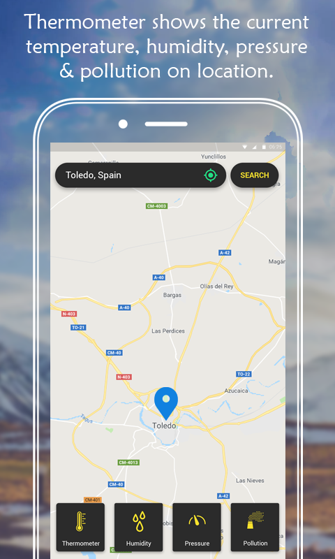- Die Thermometer-App zeigt die aktuelle Außentemperatur, Luftfeuchtigkeit und den Luftdruck basierend auf Ihrem aktuellen Standort an.