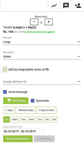 Thinkspot delivering fresh tender coconuts to your doorstep every morning. We guarantee 350ml of water on large nut category and we have smaller version of that and it doesn't have any guarantee of minimum water.