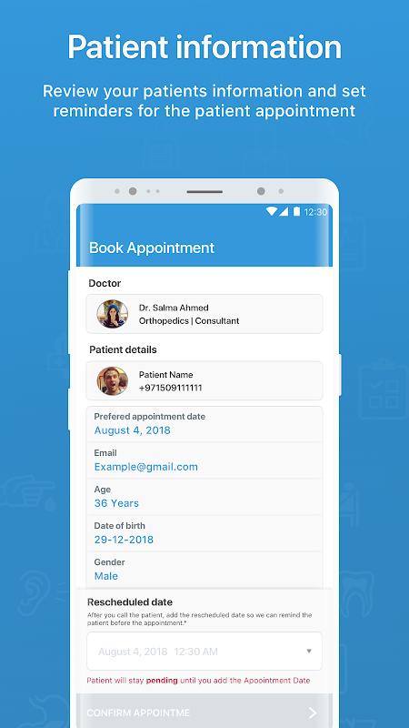 * Make sure that your patient will not miss his next appointment by setting the agreed appointment time and date and leave it to our smart automatic reminders.