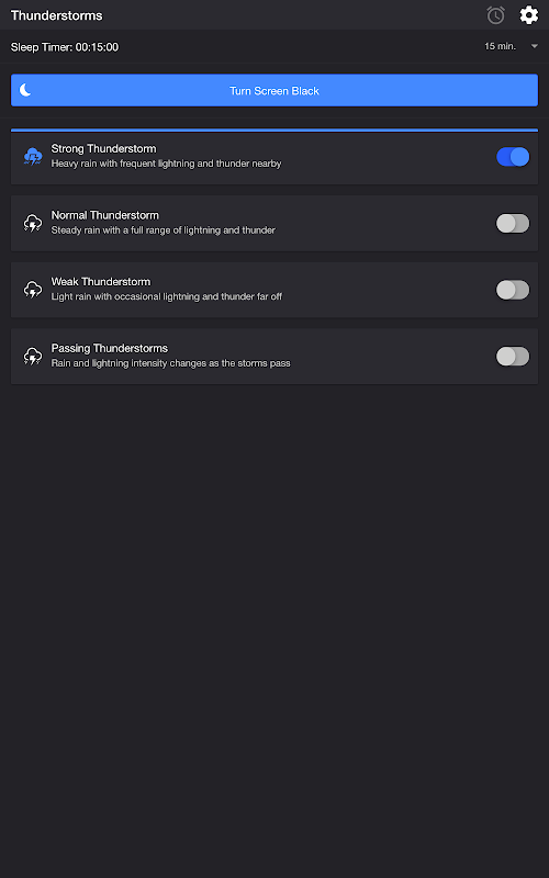 • Turn Screen Black fügt eine schwarze Überlagerung hinzu und stellt Ihr Mobilgerät auf die minimale Helligkeit ein. Die Einstellung für die Verzögerung der Bildschirmhelligkeit gleicht die minimale bis maximale Helligkeitsverzögerung auf einigen Mobilgeräten aus. Auf 0,25-1 Sekunden einstellen, wenn die Blitzlichteffekte des Bildschirms nicht die Spitzenhelligkeit erreichen, wenn der Blitz am nächsten ist, d. H. Der Donner am lautesten ist.