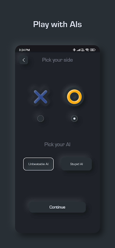 Play with our Unbeatable AI and Stupid AI and have fun. Unlike other Tic Tac Toe games on the market you will always find Tic Tac Toe Midnight Unbeatable AI & Stupid AI to be fresh and entertaining. If that is not all you can play with your friend Offline. This puzzles games is recommended for kids & adults too.