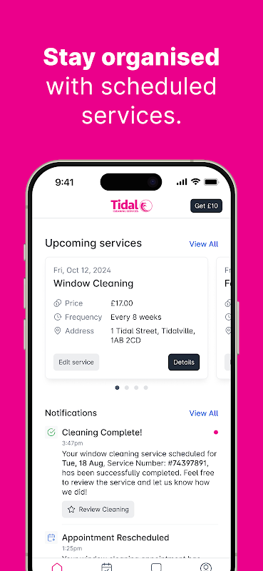 „Tidal revolutioniert die Fensterreinigung mit einem benutzerfreundlichen Service, der Komfort und Qualität in Ihr Leben bringt. Vereinbaren Sie Termine mit nur wenigen Fingertipps, verfolgen Sie Ihren Servicemitarbeiter in Echtzeit, zahlen Sie sicher in der App und bewerten Sie Ihre Erfahrung.“ für kontinuierliche Verbesserung.